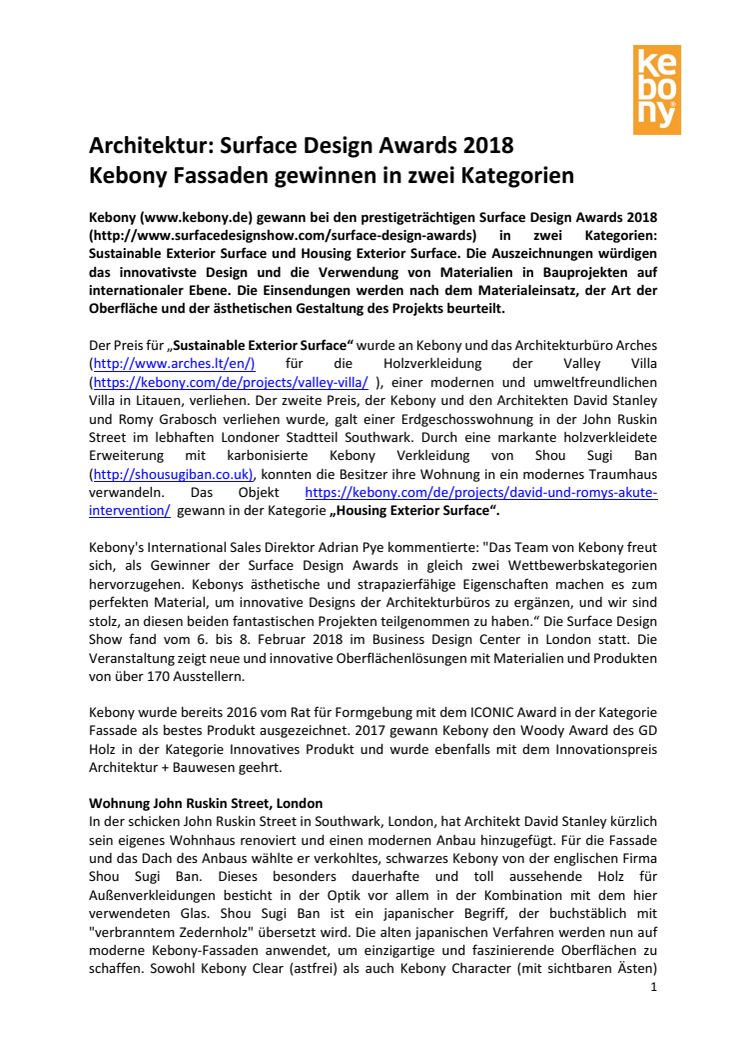 Kebony gewann bei den prestigeträchtigen Surface Design Awards 2018 in zwei Kategorien: "Sustainable Exterior Surface" und "Housing Exterior Surface". Die Auszeichnungen würdigen das innovativste Design und die Verwendung von Materialien in Bauprojekten auf internationaler Ebene. Die Fassaden wurden nach Materialeinsatz, Art der Oberfläche und der ästhetischen Gestaltung des Projekts beurteilt.