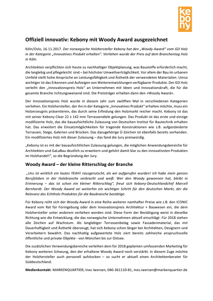 Offiziell innovativ: Kebony mit Woody Award vom GD Holz ausgezeichnet