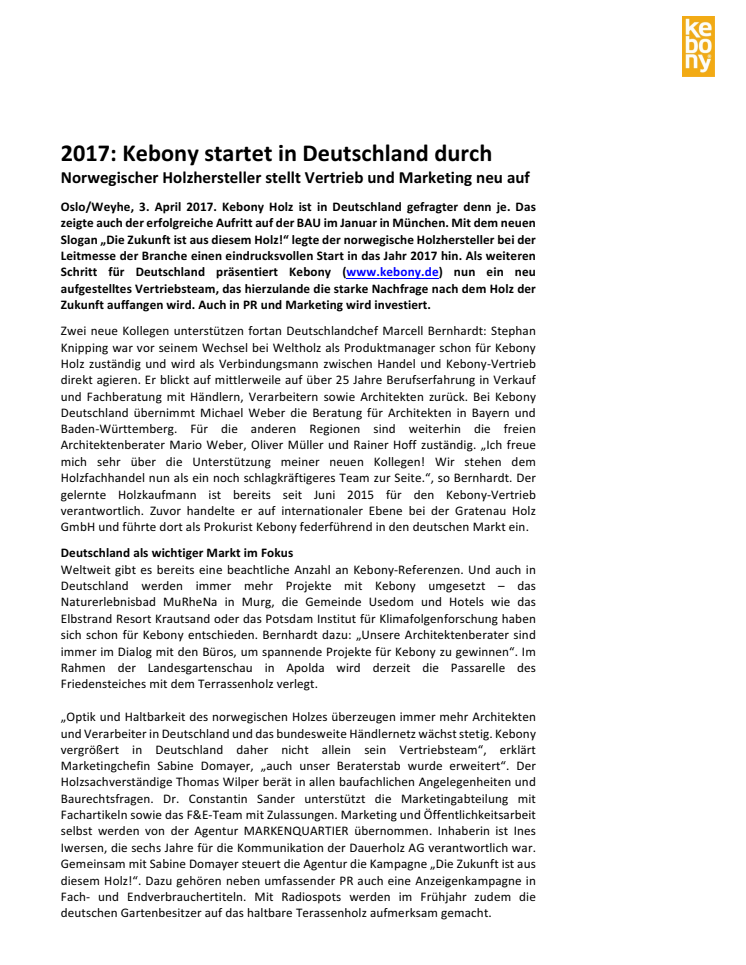Kebony Holz ist in Deutschland gefragter denn je. Das zeigte auch der erfolgreiche Aufritt auf der BAU im Januar in München. Als weiteren Schritt für Deutschland präsentiert Kebony (www.kebony.de) nun ein neu aufgestelltes Vertriebsteam, das hierzulande die starke Nachfrage nach dem Holz der Zukunft auffangen wird. Auch in PR und Marketing wird investiert.