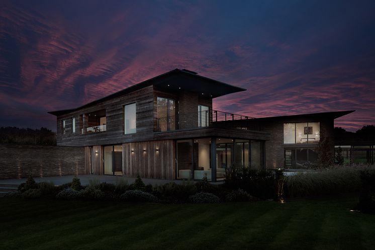 In Hampshire steht ein neu gebautes Familienhaus mit einer außergewöhnlichen Architektur – eingerahmt von großzügigen Außensportanlagen. Für die Fassade wählte das planende Architekturbüro AR Design Studio Kebony Clear. Diese Außenverkleidung wurde sehr bewusst für die Fassade des Anwesens verwendet, dessen drei ineinander verschachtelte Blöcke sich elegant um einen zentralen Innenhof anordnen.