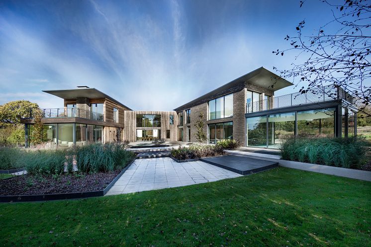 In Hampshire steht ein neu gebautes Familienhaus mit einer außergewöhnlichen Architektur – eingerahmt von großzügigen Außensportanlagen. Für die Fassade wählte das planende Architekturbüro AR Design Studio Kebony Clear. Diese Außenverkleidung wurde sehr bewusst für die Fassade des Anwesens verwendet, dessen drei ineinander verschachtelte Blöcke sich elegant um einen zentralen Innenhof anordnen.