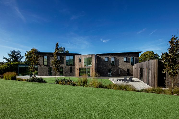 In Hampshire steht ein neu gebautes Familienhaus mit einer außergewöhnlichen Architektur – eingerahmt von großzügigen Außensportanlagen. Für die Fassade wählte das planende Architekturbüro AR Design Studio Kebony Clear. Diese Außenverkleidung wurde sehr bewusst für die Fassade des Anwesens verwendet, dessen drei ineinander verschachtelte Blöcke sich elegant um einen zentralen Innenhof anordnen.
