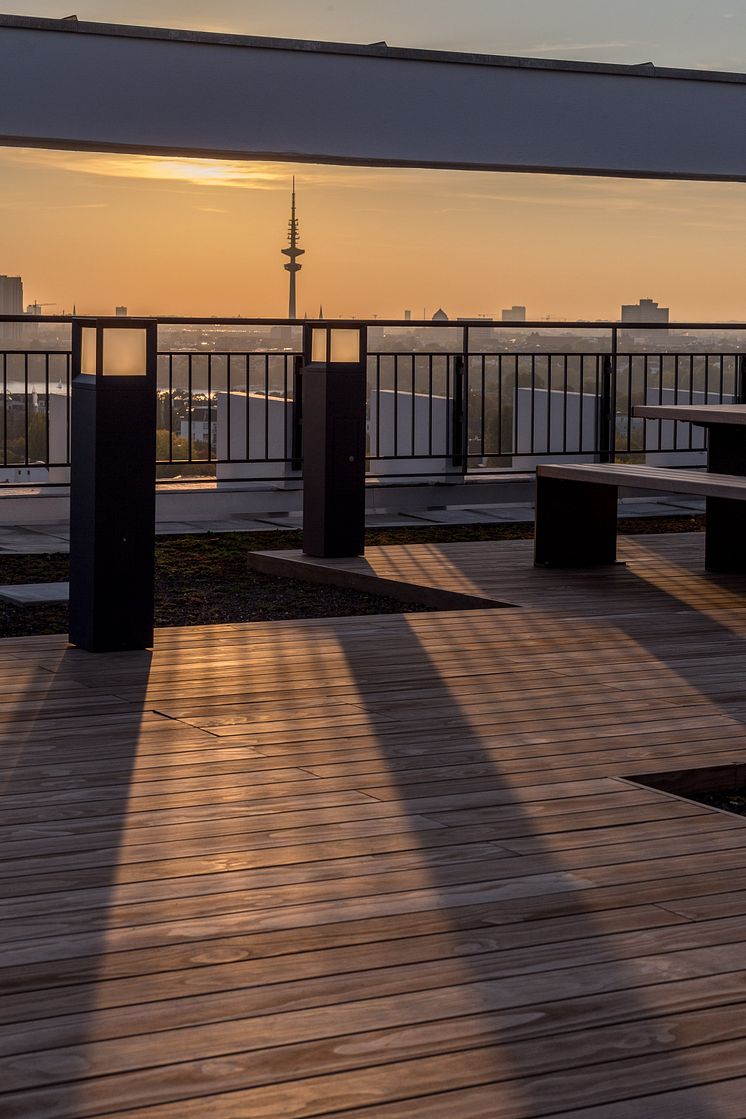 Eine Holzterrasse die dem regnerischen Hamburger Klima standhält und zudem noch auf 100 Meter Höhe dem Wind trotzt ist baulich eine Herausforderung. Die ansässige Hamburger Schulbehörde wünschte sich aber eine Dachterrasse um den Mitarbeitern frische Luft zu ermöglichen – ohne den Weg runter aus der 17. Etage. Die Lösung fand das Büro Jan Klinker Architekten: „Die Auswahl an Hölzern ist für diesen Zweck nicht allzu groß, denn die Haltbarkeit muss dann auch dem Bauaufwand entsprechen“, erklärt Architekt Sven Gabelenz. Die Wahl fiel auf Kebony Holz – ein besonders haltbares, FSC-zertifiziertes Holz mit 30 Jahren Garantie.