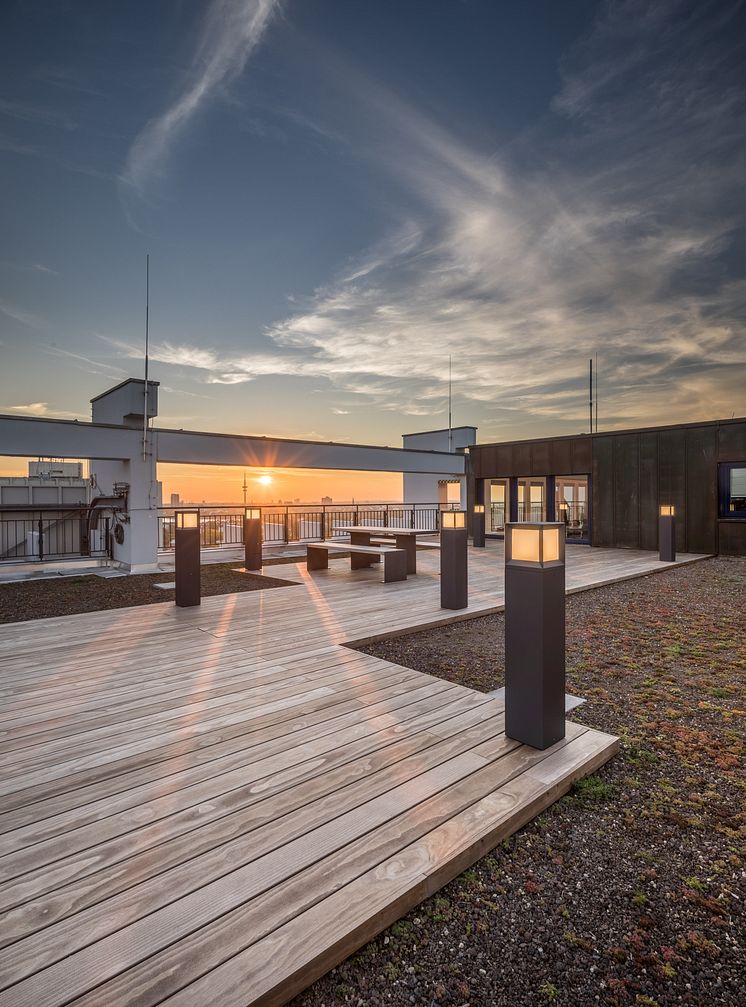 Eine Holzterrasse die dem regnerischen Hamburger Klima standhält und zudem noch auf 100 Meter Höhe dem Wind trotzt ist baulich eine Herausforderung. Die ansässige Hamburger Schulbehörde wünschte sich aber eine Dachterrasse um den Mitarbeitern frische Luft zu ermöglichen – ohne den Weg runter aus der 17. Etage. Die Lösung fand das Büro Jan Klinker Architekten: „Die Auswahl an Hölzern ist für diesen Zweck nicht allzu groß, denn die Haltbarkeit muss dann auch dem Bauaufwand entsprechen“, erklärt Architekt Sven Gabelenz. Die Wahl fiel auf Kebony Holz – ein besonders haltbares, FSC-zertifiziertes Holz mit 30 Jahren Garantie.