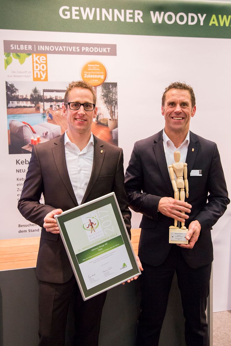 Kebony erhält den Woody Award vom GD Holz. Es freuen sich: Deutschlandchef Marcell Bernhardt (links) und sein Vertriebskollege Stephan Knipping
