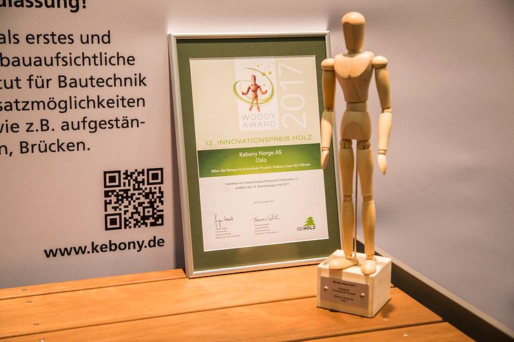Kebony erhält den Woody Award vom GD Holz. Es freuen sich: Deutschlandchef Marcell Bernhardt (links) und sein Vertriebskollege Stephan Knipping