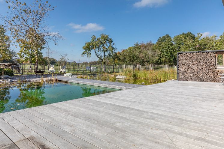 Bei Schwimmpools und Naturteichen erzielt die Verbindung von Holz und Wasser eine sehr harmonische Wirkung. Damit es auch harmonisch bleibt, muss das beispielsweise für die Poolumrandung angewandte Holz wichtige Merkmale besitzen: Eine besondere Dimensionsstabilität und lange Lebensdauer, ein geringer Pflegeaufwand und eine starke Belastbarkeit. Das sehr witterungsbeständige Holz Kebony besitzt all diese Merkmale und eignet sich daher besonders gut für Projekte in unmittelbarer Wassernähe. Bei dem Holz-Bungalow am Tegernsee wurde Kebony Clear für das teils schwimmende Terrassendeck und die Naturpool-Umrandung eingesetzt. So entstand ein Zusammenspiel aus Holzhaus, Holzterrasse und Holzsteg, welches die gewünschte Einfügung in die umliegende Natur noch mehr zur Geltung bringt.