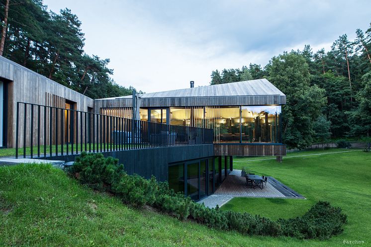 Das Architekturbüro Arches (link is external) hat eine zeitgenössische und umweltfreundliche Villa in der Nähe von Vilnius, der Hauptstadt Litauens, geschaffen. Mit seiner 650m2 großen Kebony-Holz Fassade und den unregelmäßigen Giebeldächern, die typisch für diese Gegend sind und harmonisch zu den umliegenden Hügeln und Kieferbäumen passen, fügt sich dieses einmalige Anwesen perfekt in die Landschaft ein.