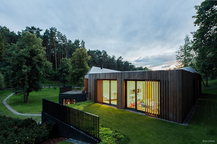 Das Architekturbüro Arches (link is external) hat eine zeitgenössische und umweltfreundliche Villa in der Nähe von Vilnius, der Hauptstadt Litauens, geschaffen. Mit seiner 650m2 großen Kebony-Holz Fassade und den unregelmäßigen Giebeldächern, die typisch für diese Gegend sind und harmonisch zu den umliegenden Hügeln und Kieferbäumen passen, fügt sich dieses einmalige Anwesen perfekt in die Landschaft ein.