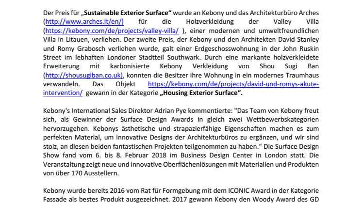 Kebony's International Sales Direktor Adrian Pye kommentierte: "Das Team von Kebony freut sich, als Gewinner der Surface Design Awards in gleich zwei Wettbewerbskategorien hervorzugehen. Kebonys ästhetische und strapazierfähige Eigenschaften machen es zum perfekten Material, um innovative Designs der Architekturbüros zu ergänzen, und wir sind stolz, an diesen beiden fantastischen Projekten teilgenommen zu haben.“ Die Surface Design Show fand vom 6. bis 8. Februar 2018 im Business Design Center in London statt. Die Veranstaltung zeigt neue und innovative Oberflächenlösungen mit Materialien und Produkten von über 170 Ausstellern.