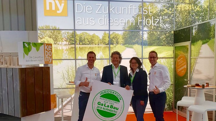 Nürnberg, 12. September 2018: Kebony hat heute auf der Messe GALABAU 2018 in Nürnberg die Innovationsmedaille für Kebony Clear (22 x 142mm), das einzige modifizierte Terrassenholz mit allgemeiner bauaufsichtlicher Zulassung (abZ) erhalten. „Planungssicherheit für den Garten- und Landschaftsbauer und der Nachhaltigkeitsaspekt haben die Jury überzeugt!“, freut sich Marcell Bernhardt, Deutschlandchef von Kebony. Mit dieser Medaille hat der Bundesverband Garten-, Landschafts- und Sportplatzbau e.V. (BGL) insgesamt 16 Produktneuheiten oder wesentliche Weiterentwicklungen von Produkten ausgezeichnet, die aus über 106 Einsendungen ausgewählt wurden. Die hochkarätige Fachjury des Innovationspreises, bestehend aus Vertretern des BGL, der Fachhochschulen, der Berufsgenossenschaft, der Landschaftsarchitekten und Unternehmen des Garten-, Landschafts- und Sportplatzbaus, hat mit ihrer Entscheidung die Weiterentwicklung von Kebony gewürdigt.