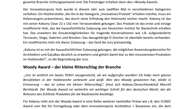 „Uns ist wirklich ein lautes YEAH! rausgerutscht, als wir aufgerufen wurden! Ich habe mein ganzes Berufsleben in der Holzbranche verbracht und weiß: Wer den Woody gewonnen hat, bleibt in Erinnerung – das ist schon ein kleiner Ritterschlag“, freut sich Kebony-Deutschlandchef Marcell Bernhardt. Der Woody Award sei weiterhin ein wichtiger Schritt für den deutschen Markt, der die Relevanz des Echtholz-Produktes für die Baubranche bestätige.