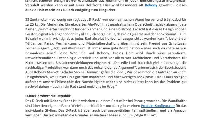 33 Zentimeter – so wenig nur ragt das „D-Rack” von der heimischen Wand hervor und trägt dabei bis zu 25 kg. Die Merkmale: Ein eloxiertes Alu-Profil mit quadratischem Querschnitt, schick abgerundete Kanten, gummierter Einschnitt für den Rahmen und eine Holzfront. Erdacht hat dieses Design Fridolin Förster, eigentlich angehender Physiker. „Ich sorge dafür, dass die Qualität und der Look stimmt – zum Beispiel war mir wichtig, dass jedes Rad absolut horizontal ausgerichtet werden kann“, betont der Tüftler bei Parax. Vermarktung und Materialbeschaffung übernimmt sein Freund aus Schultagen Torben Siegert: „Holz und Aluminium ist immer eine gute Kombination – aber auch da sollte es was Besonderes sein.“ Seine Wahl fiel auf Kebony. Dieses Holz wird durch eine patentierte, umweltfreundliche Technologie veredelt und wird vor allem von Architekten und Verarbeitern für Holzterrassen und Fassadenverkleidungen eingesetzt. „Der edle Look hat mich gleich überzeugt, die nachhaltige Produktion war dann noch das entscheidende Argument“, erinnert sich der Sportstudent. Auch Kebony Marketingchefin Sabine Domayer gefiel die Idee. „Wir bekommen oft Anfragen aus dem Designbereich, weil unser Holz gut zum modernen und hochwertigen Look passt. Das D-Rack spiegelt außerdem unsere Philosophie der Nachhaltigkeit wider und nicht zuletzt kann ich das Problem gut nachvollziehen – auch mein Rad stand meistens im Weg.“