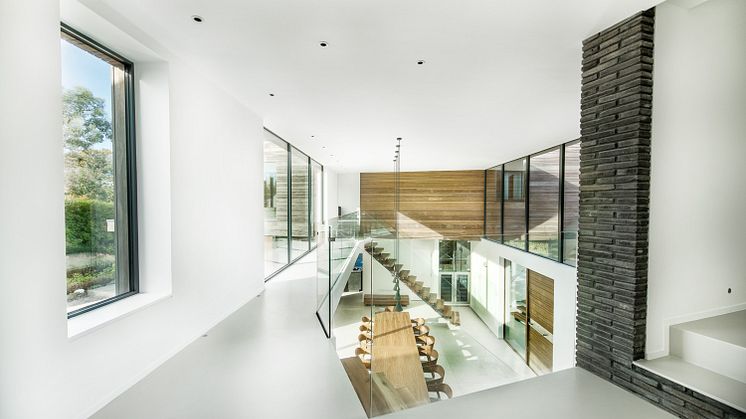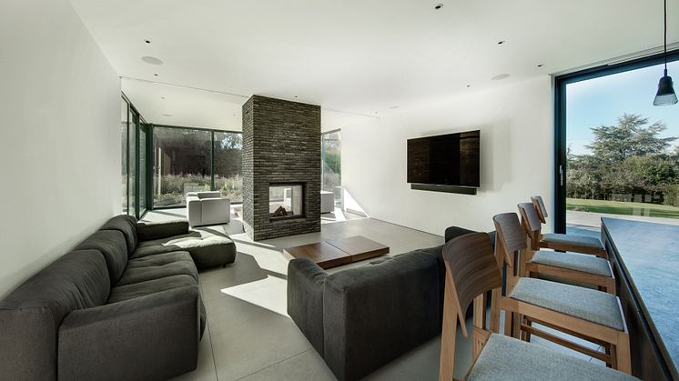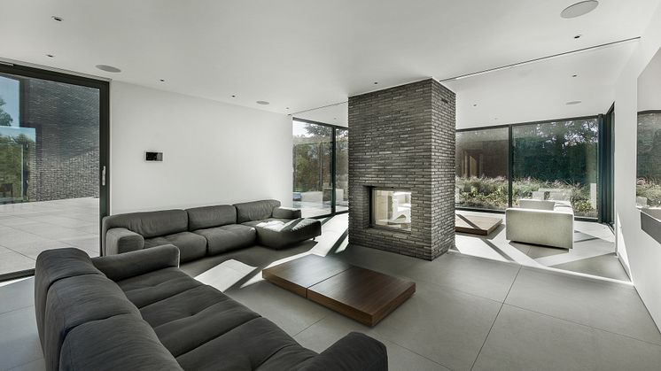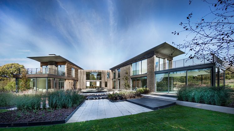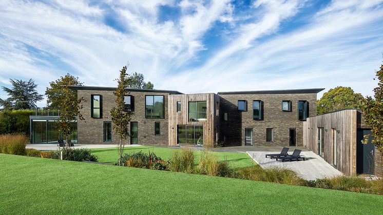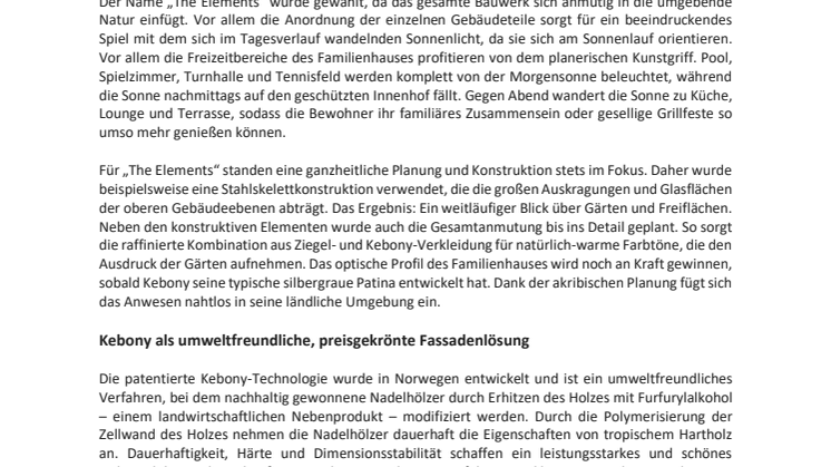 Für „The Elements“ standen eine ganzheitliche Planung und Konstruktion stets im Fokus. Daher wurde beispielsweise eine Stahlskelettkonstruktion verwendet, die die großen Auskragungen und Glasflächen der oberen Gebäudeebenen abträgt. Das Ergebnis: Ein weitläufiger Blick über Gärten und Freiflächen. Neben den konstruktiven Elementen wurde auch die Gesamtanmutung bis ins Detail geplant. So sorgt die raffinierte Kombination aus Ziegel- und Kebony-Verkleidung für natürlich-warme Farbtöne, die den Ausdruck der Gärten aufnehmen. Das optische Profil des Familienhauses wird noch an Kraft gewinnen, sobald Kebony seine typische silbergraue Patina entwickelt hat. Dank der akribischen Planung fügt sich das Anwesen nahtlos in seine ländliche Umgebung ein.