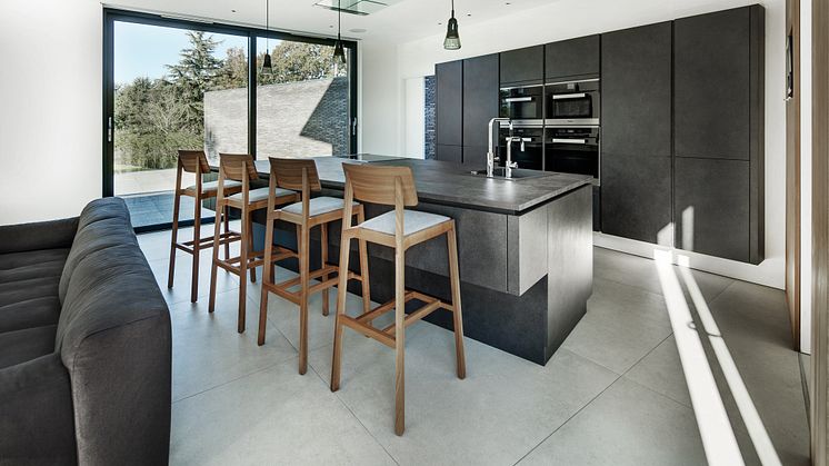 Die patentierte Kebony-Technologie wurde in Norwegen entwickelt und ist ein umweltfreundliches Verfahren, bei dem nachhaltig gewonnene Nadelhölzer durch Erhitzen des Holzes mit Furfurylalkohol – einem landwirtschaftlichen Nebenprodukt – modifiziert werden. Durch die Polymerisierung der Zellwand des Holzes nehmen die Nadelhölzer dauerhaft die Eigenschaften von tropischem Hartholz an. Dauerhaftigkeit, Härte und Dimensionsstabilität schaffen ein leistungsstarkes und schönes Holzprodukt. Derlei zukunftsweisende Materialien in perfektem Einklang mit zeitlosem Stil sorgen letztlich dafür, dass das Familienhaus in Hampshire seiner idyllischen Landschaft gerecht wird.