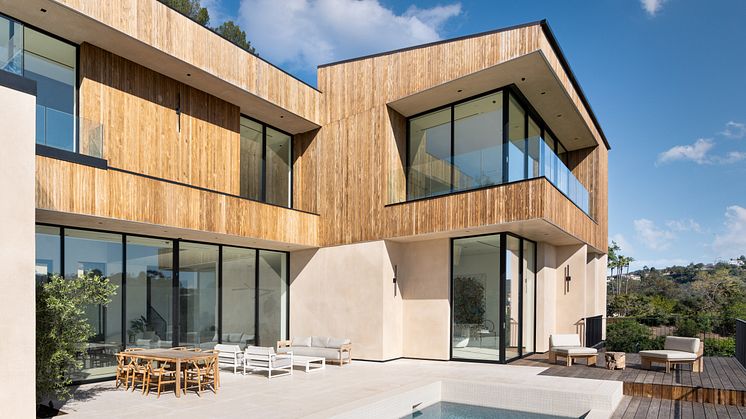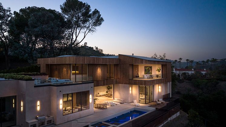 Weyhe, Juli 2022. Die atemberaubende Residenz mit fünf Schlafzimmern bietet einen weiten Blick auf Century City, Downtown LA, das Hollywoodreservoir und den Pazifischen Ozean. Fassade und Holzterrasse wurden mit Kebony erstellt. Das 7.500 Quadratmeter große Haus befindet sich auf einem 2,5 Hektar großen Grundstück in einem versteckten Viertel mit vielen exklusiven Häusern. Es wurde von HM DG-Direktor Hassan Majd entworfen und von http://hmdginc.com gebaut. Nun wurde es für fast 12 Millionen US-Dollar verkauft. Das Äußere des zweistöckigen Hauses ist auf der ersten Ebene mit sandfarbenem Stein und auf der zweiten mit Kebony verkleidet. Das Holz ist mit Bio-Alkohol imprägniert und trotz Umwelteinflüssen und Schädlingen. Das hochwertige Material ist nahezu wartungsfrei und altert nach und nach zu einem schönen silbergrau.