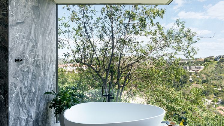 Das Hauptschlafzimmer, das über die Terrasse hinausragt, ist beeindruckend. „Ich liebe, wie es den besten Blick auf das Grundstück bietet, mit freiem Blick auf Los Angeles und die Hollywood Hills“, sagte Majd. Das Hauptbad ist mit dunkelkohlegrauem Marmor mit Lederfinish ausgestattet, und die Glaskabine schwebt in der Luft mit Blick auf die Hollywood Hills und Century City und darüber hinaus – privat, aber offen. “Draußen auf der Hauptebene führen Treppen vom Pool- und Terrassenbereich den landschaftlich gestalteten Hang hinunter und bieten zusätzliche Aussichten.