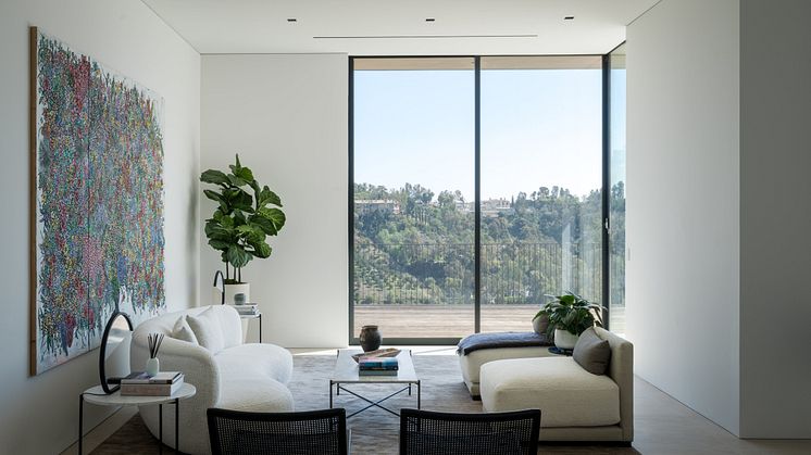Im Inneren erhebt sich der Eingang zu einem doppelt hohen Volumen, das von einer umgekehrten Pyramidendecke gekrönt wird. Das Highlight ist eine weitläufige Glaswand, die sich zum Pool und zur Terrasse und einem spektakulären Blick auf Los Angeles öffnet. Automatisierte Taschentüren verschwinden vollständig in den Wänden, perfekt für den südkalifornischen Indoor-Outdoor-Lifestyle.