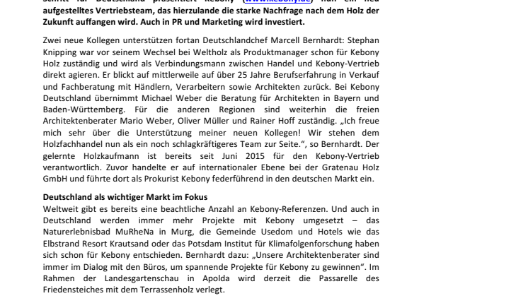 Zwei neue Kollegen unterstützen fortan Deutschlandchef Marcell Bernhardt: Stephan Knipping war vor seinem Wechsel bei Weltholz als Produktmanager schon für Kebony Holz zuständig und wird als Verbindungsmann zwischen Handel und Kebony-Vertrieb direkt agieren. Er blickt auf mittlerweile auf über 25 Jahre Berufserfahrung in Verkauf und Fachberatung mit Händlern, Verarbeitern sowie Architekten zurück. Bei Kebony Deutschland übernimmt Michael Weber die Beratung für Architekten in Bayern und Baden-Württemberg. Für die anderen Regionen sind weiterhin die freien Architektenberater Mario Weber, Oliver Müller und Rainer Hoff zuständig. „Ich freue mich sehr über die Unterstützung meiner neuen Kollegen! Wir stehen dem Holzfachhandel nun als ein noch schlagkräftigeres Team zur Seite.“, so Bernhardt. Der gelernte Holzkaufmann ist bereits seit Juni 2015 für den Kebony-Vertrieb verantwortlich. Zuvor handelte er auf internationaler Ebene bei der Gratenau Holz GmbH und führte dort als Prokurist Kebony federführend in den deutschen Markt ein.