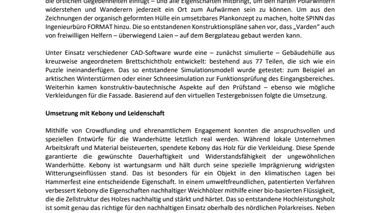 Mithilfe von Crowdfunding, Spenden und ehrenamtlichem Engagement konnten die anspruchsvollen und speziellen Entwürfe für die Wanderhütte letztlich real werden. Während lokale Unternehmen Arbeitskraft und Material beisteuerten, spendete Kebony das Holz für die Verkleidung. Diese Spende garantierte die gewünschte Dauerhaftigkeit und Widerstandsfähigkeit der ungewöhnlichen Wanderhütte. Kebony ist wartungsarm und hält durch seine spezielle Imprägnierung widrigsten Witterungseinflüssen stand. Das ist besonders für ein Objekt in den klimatischen Lagen bei Hammerfest eine entscheidende Eigenschaft. In einem umweltfreundlichen, patentierten Verfahren verbessert Kebony die Eigenschaften nachhaltiger Weichhölzer mithilfe einer bio-basierten Flüssigkeit, die die Zellstruktur des Holzes nachhaltig und stärkt und härtet. Das so entstandene Hochleistungsholz ist somit genau das richtige für den nachhaltigen Einsatz oberhalb des nördlichen Polarkreises. Neben den konstruktiven Vorteilen unterstreicht die Anmutung von Kebony das Design von „Varden“. Denn die silbergraue Patina, die Kebony bei direkter Bewitterung ausbildet, fügt sich – ebenso wie die organische Form der Wanderhütte - ganz hervorragend in die raue, felsige Landschaft.